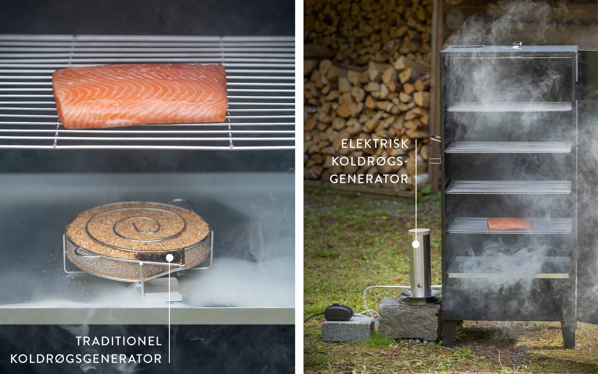 Koldrøgsgenerator med elektrisk luftflow – Fyldes med spån og drives med strøm. Røgen ledes ind i et røgeskab, en grill eller lignende. Spånerne brænder langsomt og giver en mild røg, hvor mængden let styres via en elektrisk luftpumpe. Kapaciteten er ca. 10 dl spån og en brændetid ca. 3–4 timer (kan genopfyldes under brug).