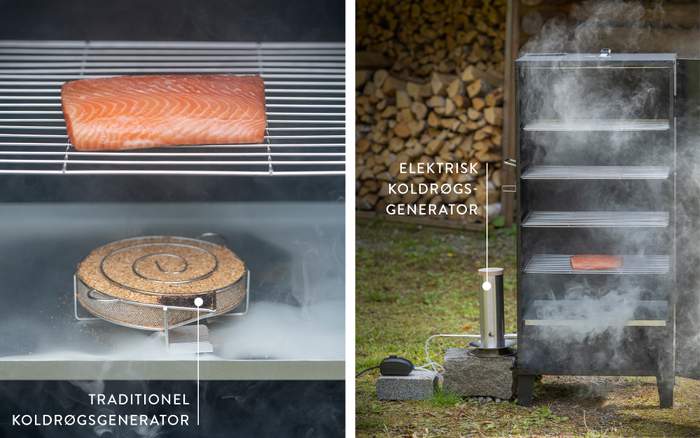 Det praktiske røgeskab fra Mustang er udstyret med fire grillriste, kroge og ventilationsåbninger, der hjælper med at fjerne fugt. For at kunne koldrøge skal du bruge en røgenerator. Her er forskellen på de to typer: