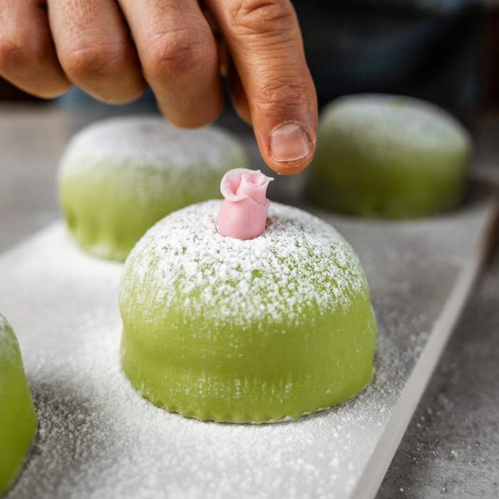 Bag en tynd og luftig lagkagebund, der udstikkes i små cirkler. Mellem to bunde kommes hindbærsyltetøj og hjemmelavet vaniljecreme, top med flødeskum og afslut med et tyndt lag udrullet marcipan. Drys let med flormelis og pynt med en lille rose for det klassiske udtryk.