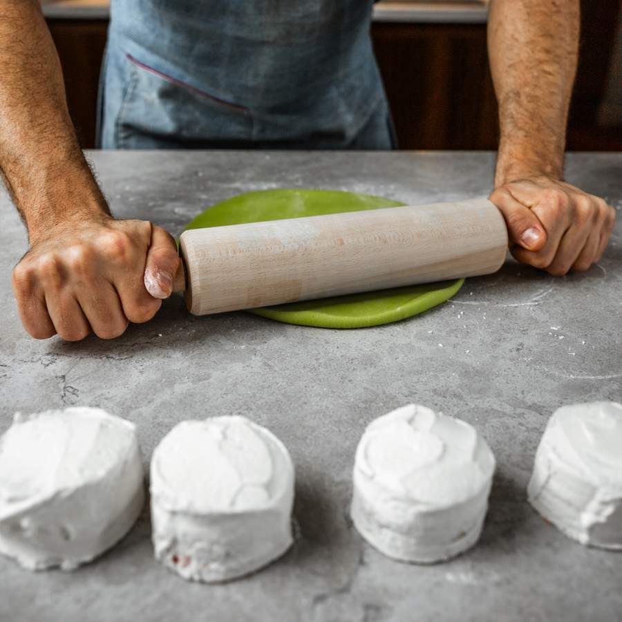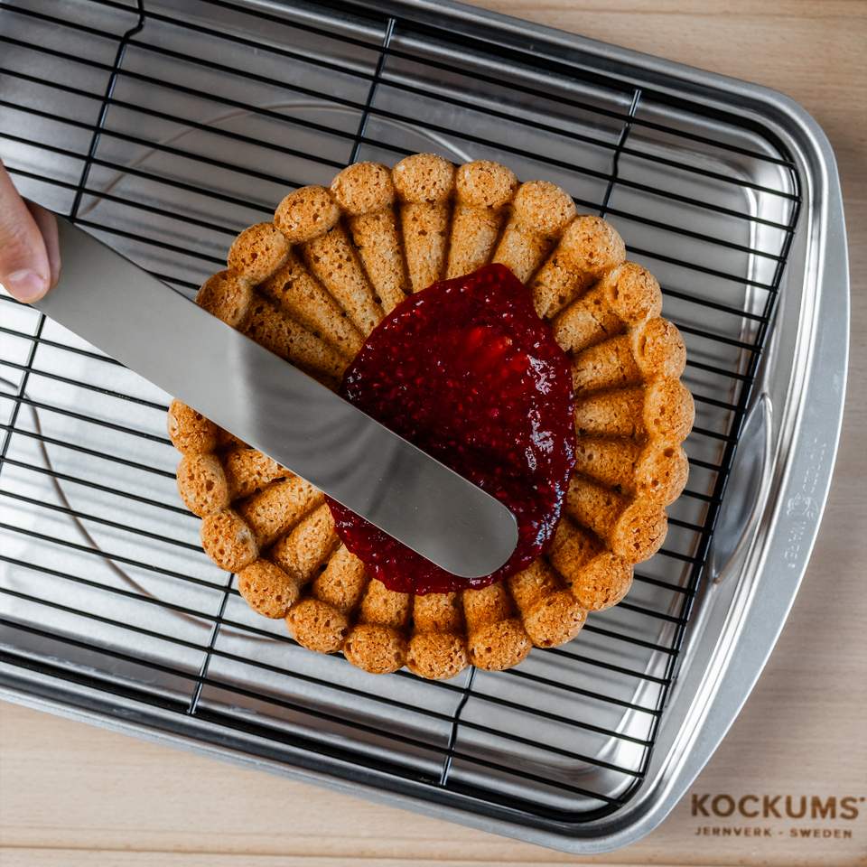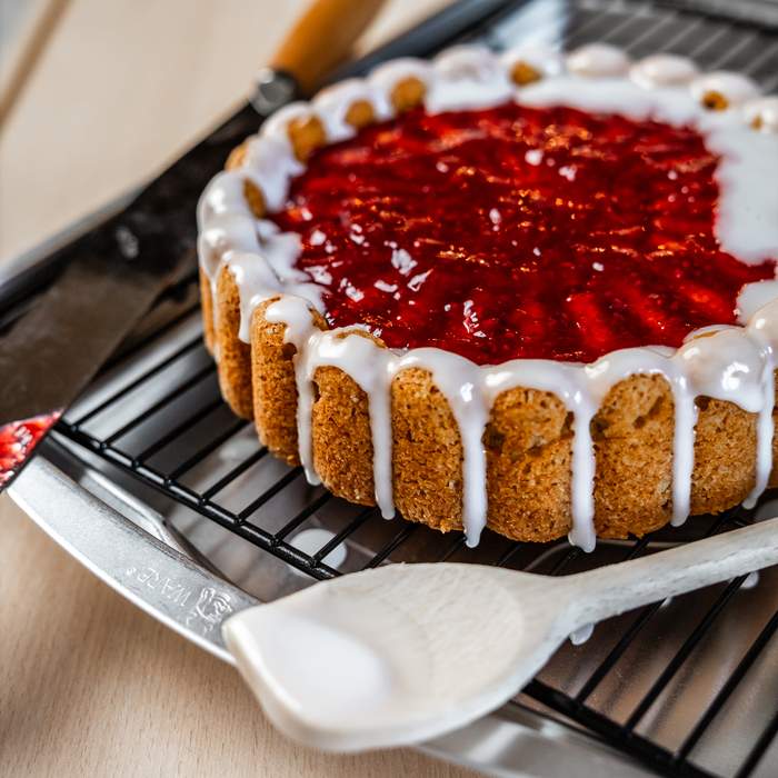 Bag en blød kage med smør, æg, mandelmel og fløde for ekstra saftighed. Når kagen er afkølet, dækkes toppen med hindbærsyltetøj og pyntes med en dekorativ ring af flormelisglasur. Et klassisk udtryk, der gør Runeberg-kagen let genkendelig.