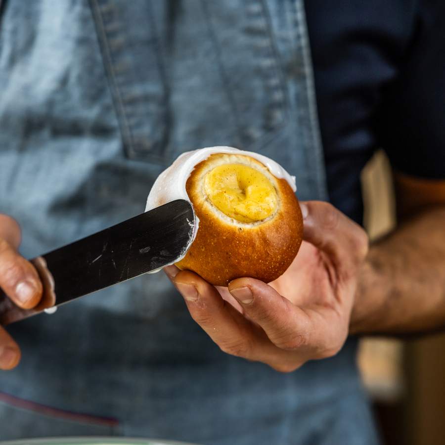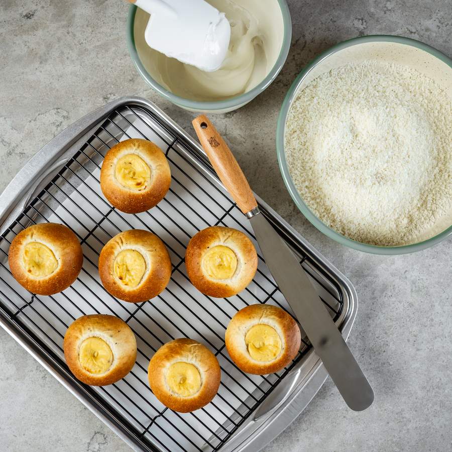 En smørrig gærdej æltes grundigt i køkkenmaskine for maksimal luftighed, som får lov at hvile koldt, inden bollerne formes. Efter hævning fyldes midten generøst med vaniljecreme, og bollerne bages gyldne. Når de er afkølede, pyntes de med glasur på siderne og vendes i revet kokos – prikken over i’et på denne norske klassiker.