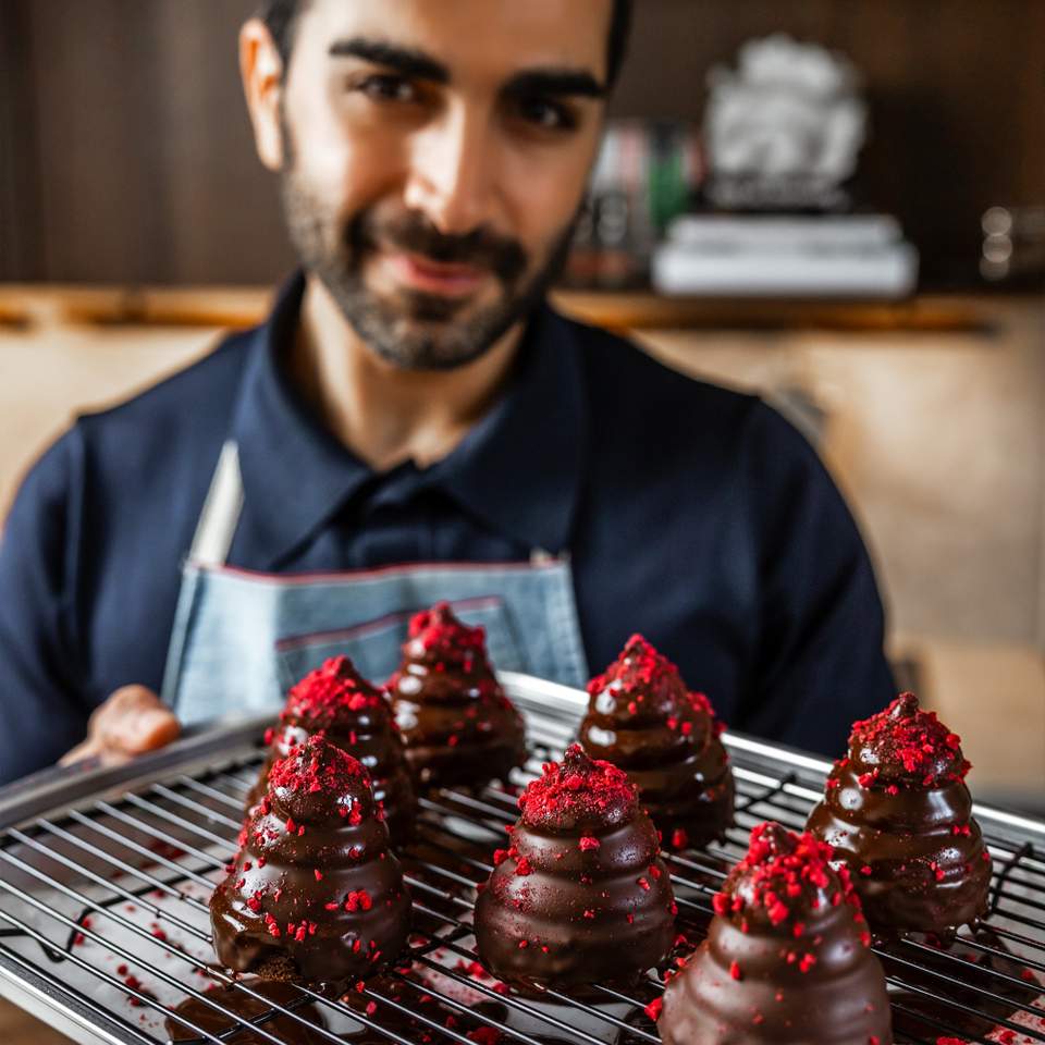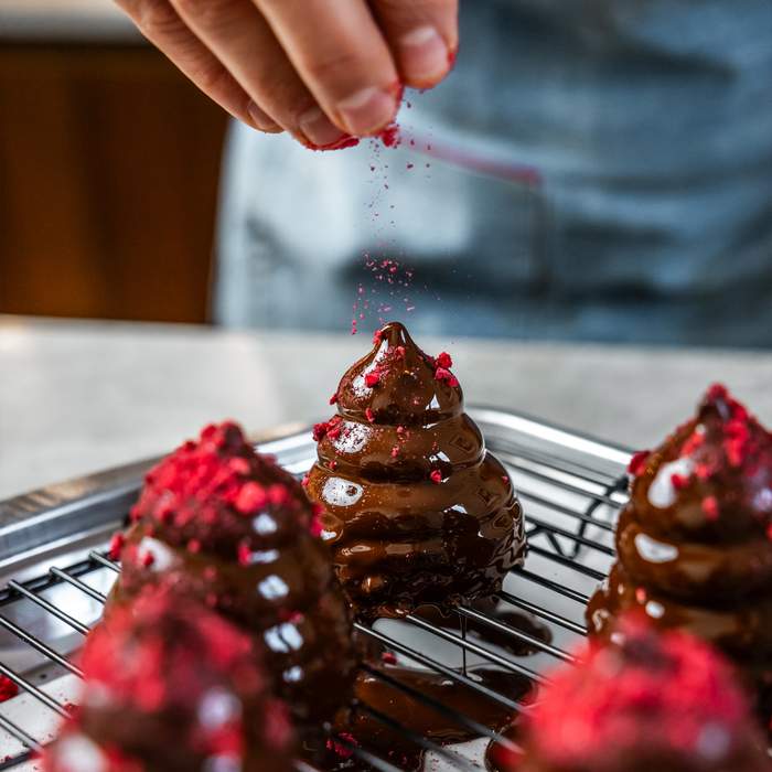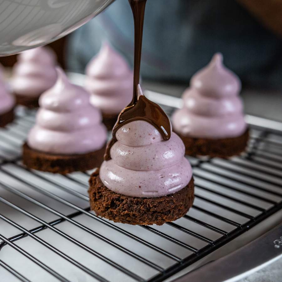 Du starter med at bage en kompakt brownie, som udstikkes i små runde bunde. Ovenpå sprøjtes en italiensk marengs smagt til med hindbær, som får lov at sætte sig. Til sidst overtrækkes hver flødebolle med mørk chokolade og pyntes med frysetørrede hindbær for både farve og friskhed.
