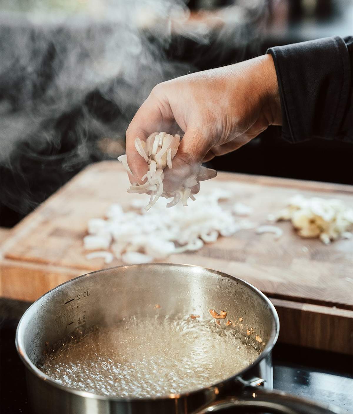 Skær skalotteløg og hvidløg i tynde skiver. Brug en rummelig gryde med høje kanter, og sørg for, at den er helt tør – varm den evt. op tom over lav varme for at sikre det.