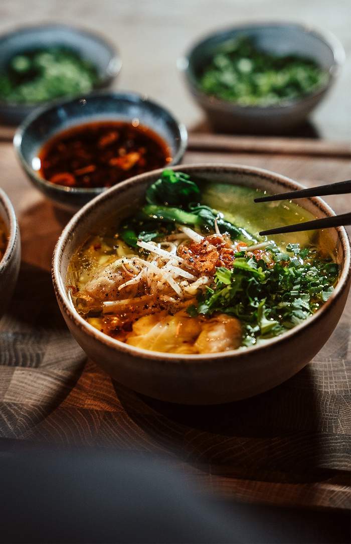 Topping: Wontons, koriander, forårsløg, bønnespirer, pak choi, sort peber og sprød løgolie