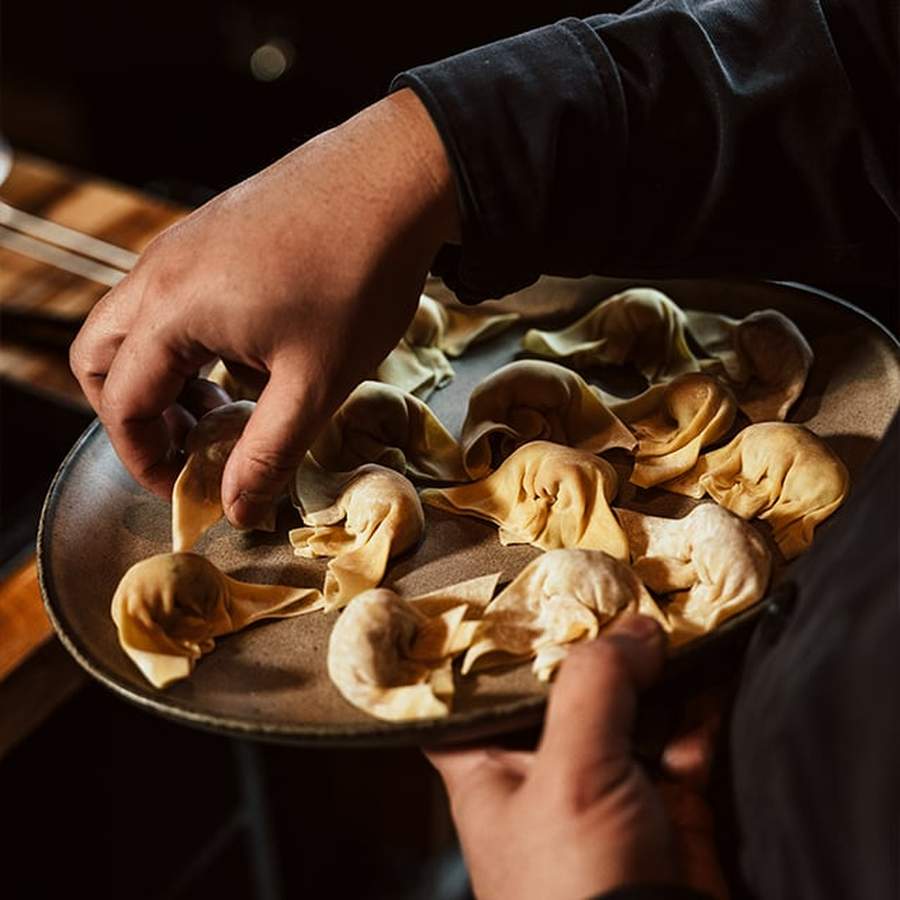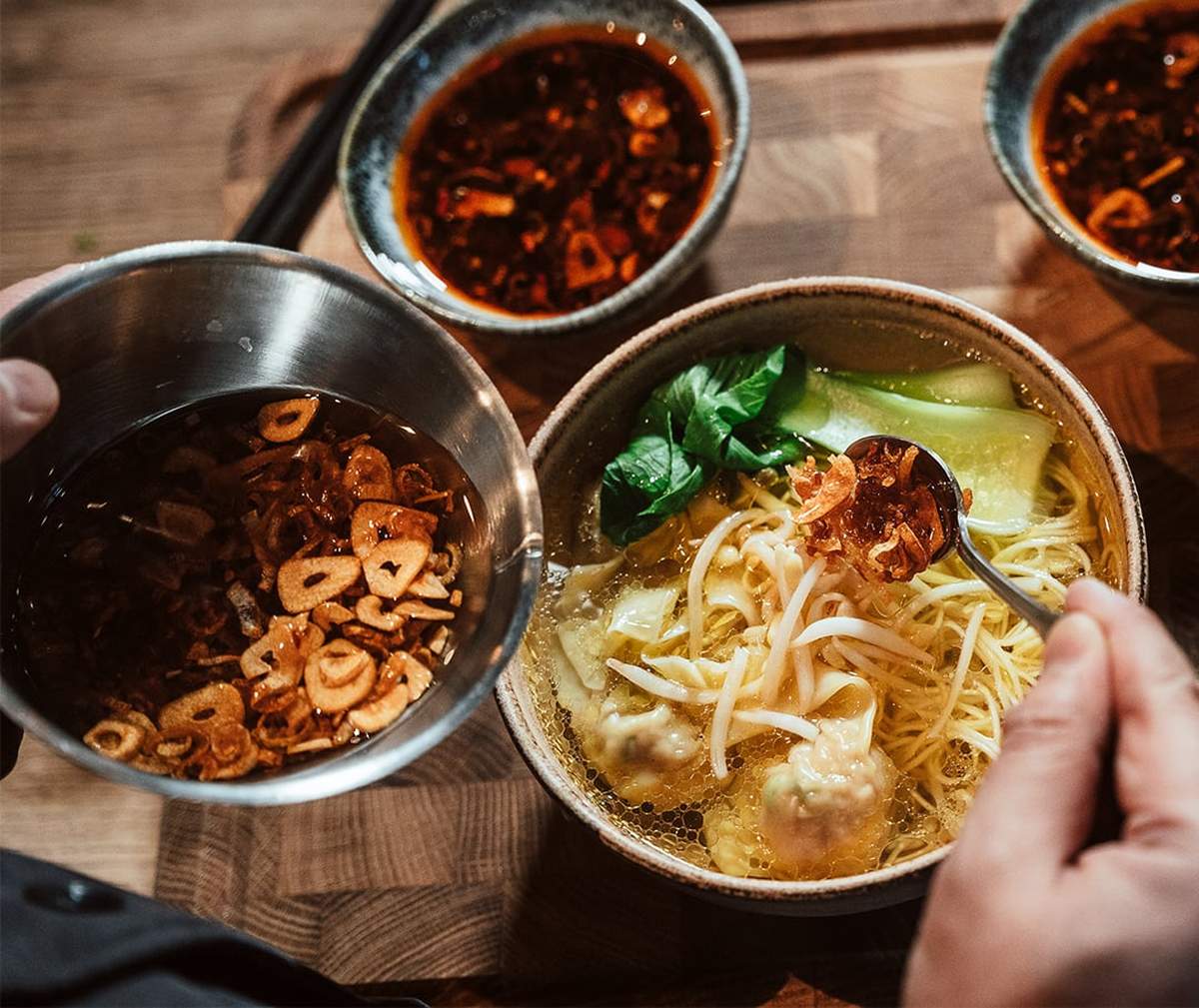 Ægnudler i kyllingebouillon serveret med blandt andet chinkiang-sauce, sprød løgolie og wontons fyldt med rejer og svinekød!