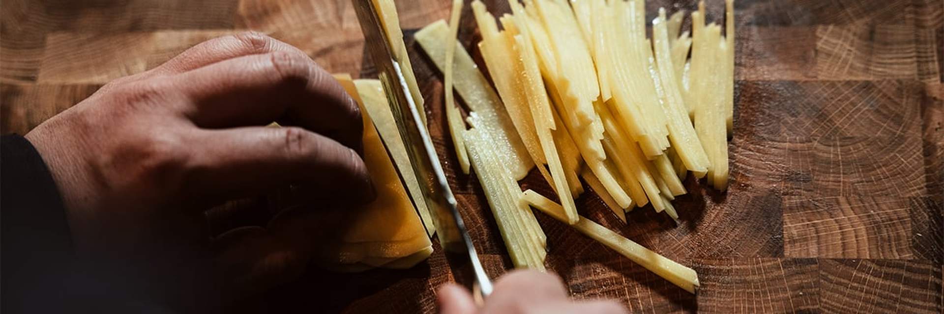 Skræl kartoflerne og skær dem i skiver på ca. 3–4 mm med en mandolin. Skær derefter skiverne i tynde strimler.