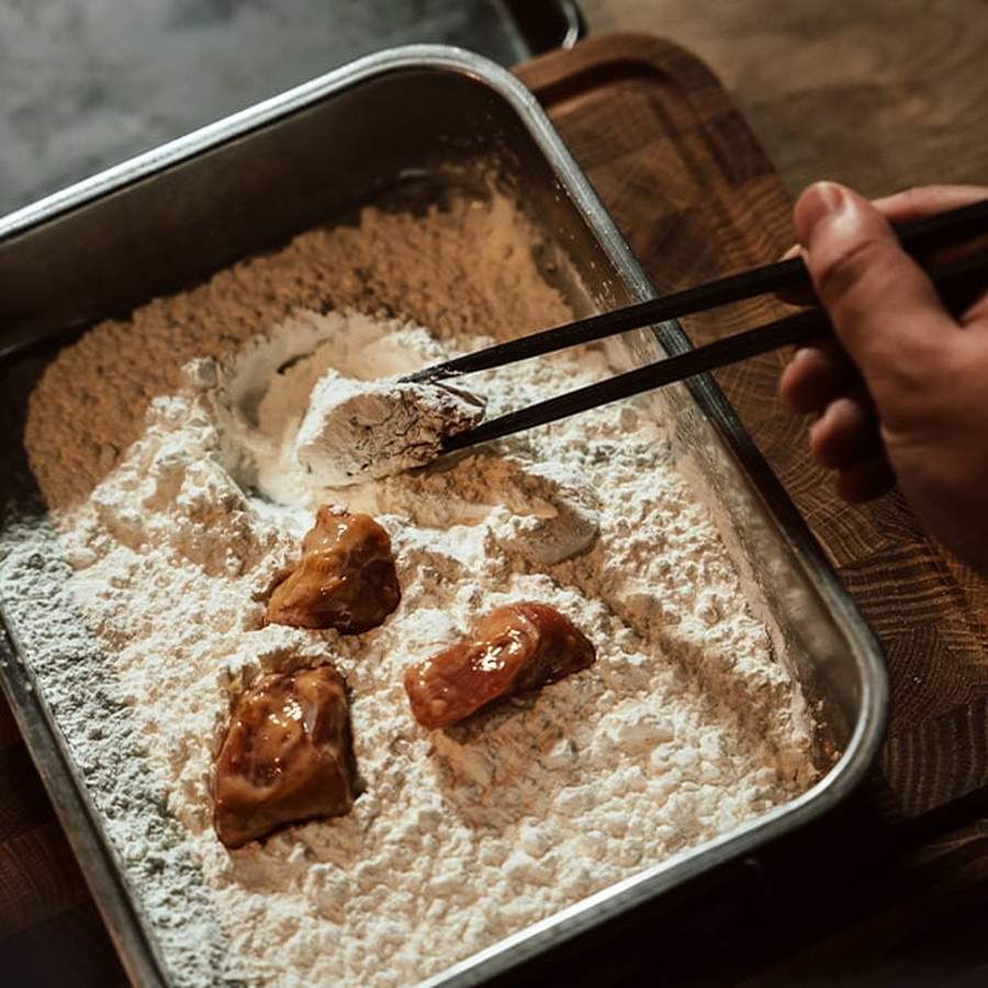 Varm olie op til 180 °C og fritér kødet, til det er gyldent. Tag det op og lad det dryppe af på en rist. Fritér det igen lige før servering for ekstra sprødhed.