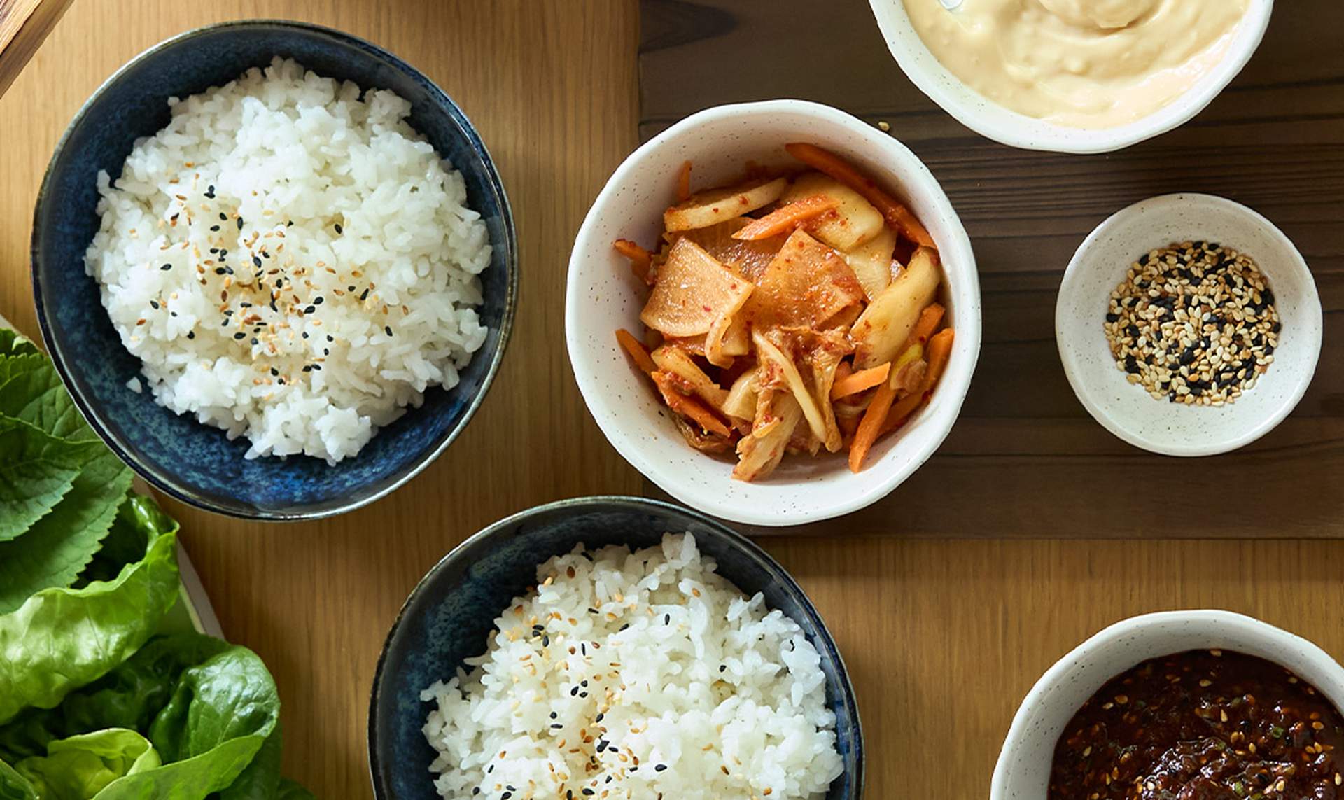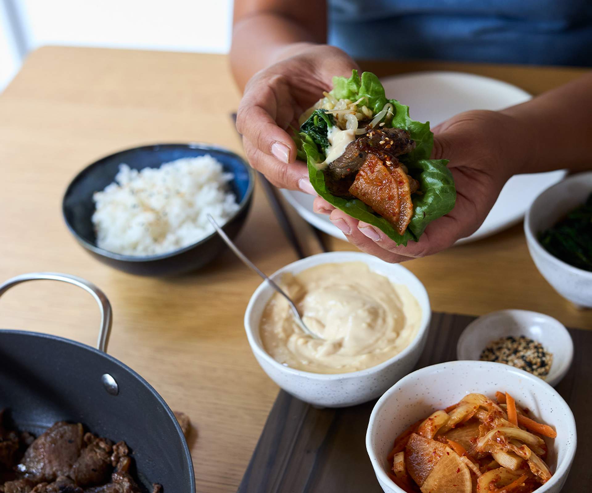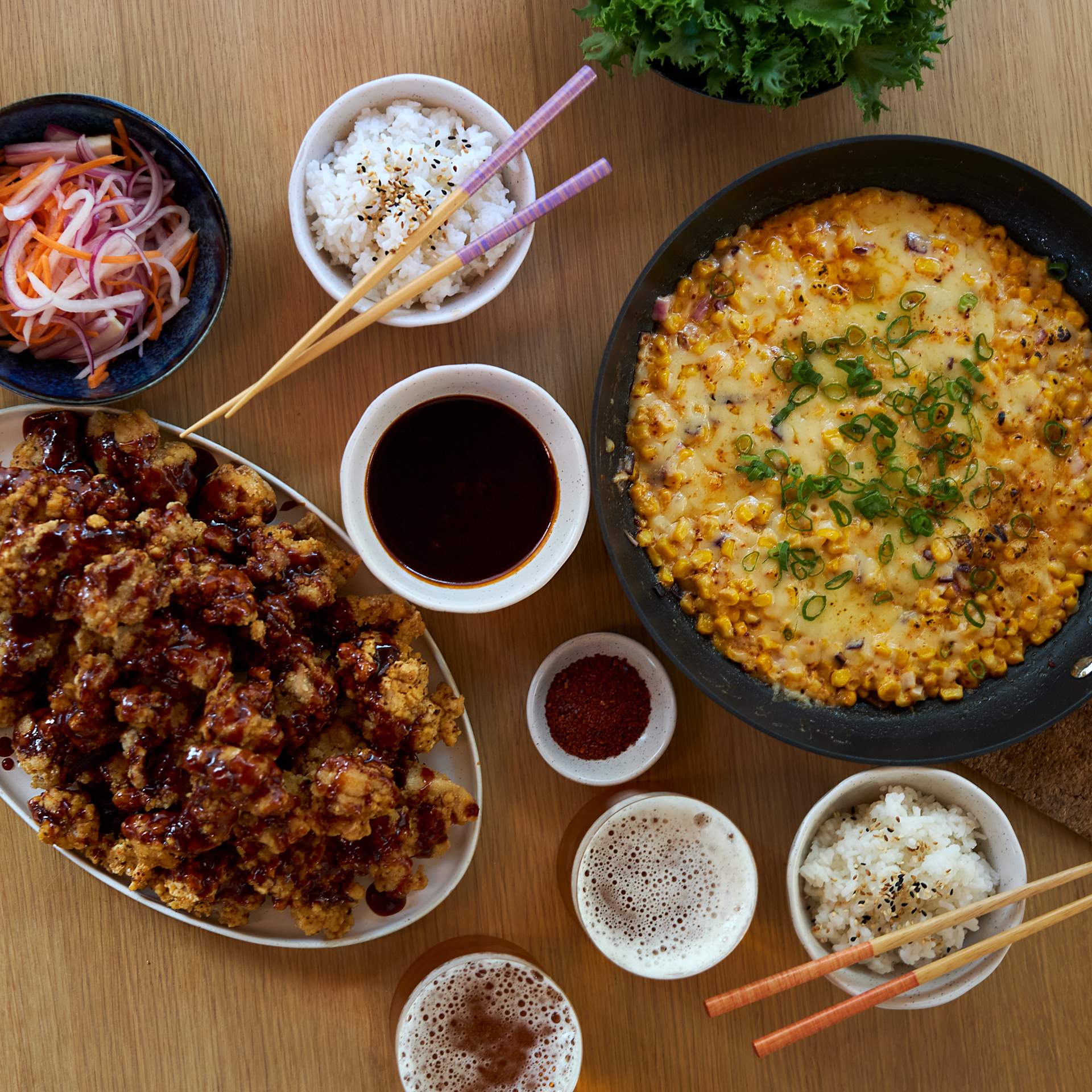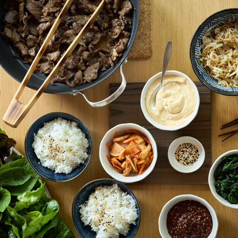 Korean BBQ, hvor maden tilberedes på en grill midt på bordet, er almindeligt på koreanske restauranter, men derhjemme tilbereder koreanerne som regel kødet på komfuret og serverer det frem med ris og tilbehør. Alt serveres “family style”, dvs. at alt stilles på bordet, og alle tager, hvad de vil have, direkte fra skålene. Den mest almindelige form for Korean BBQ er bulgogi, som er tyndskåret kød marineret i en smagfuld sauce lavet af soja, hvidløg og ristet sesamolie. Der findes flere forskellige varianter af bulgogi, men fælles for dem alle er grundsmagen af soja, hvidløg og sesam, hvilket giver en fantastisk smag til det, man griller eller steger.