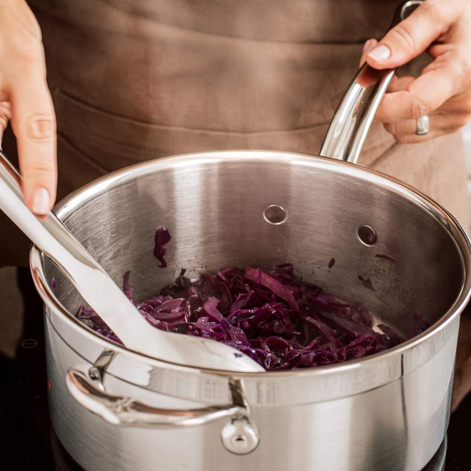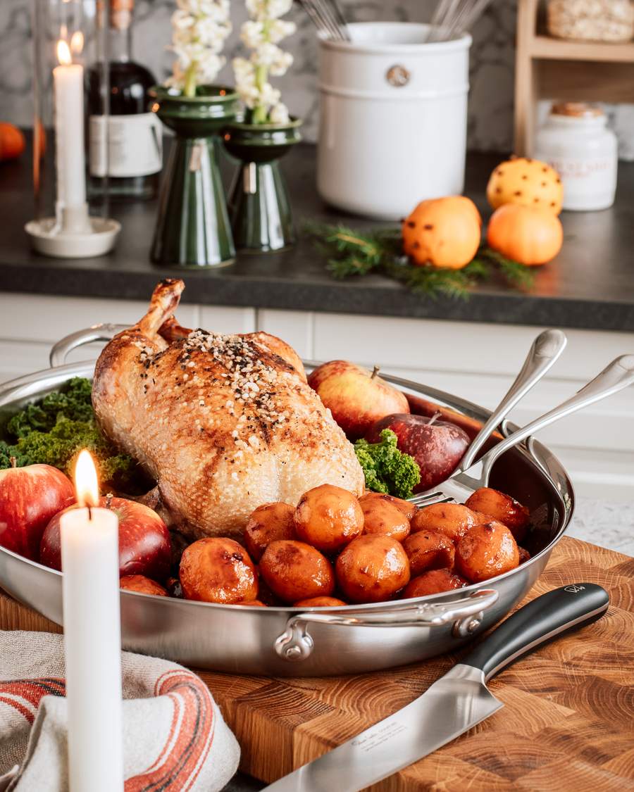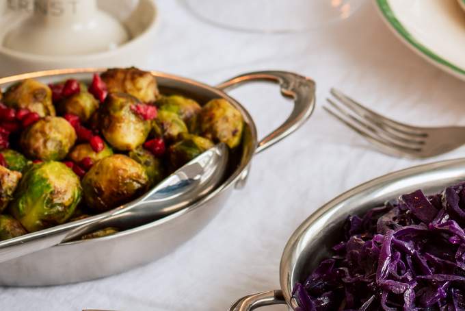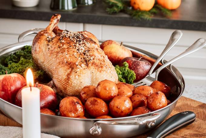 Her finder du de klassiske retter, der hører julen til såsom anden fyldt med æbler og svesker, serveret med brunede kartofler. Den fyldige sauce med ribsgele fremhæver smagene, mens den langsomt simrede rødkål skaber den perfekte balance mellem sødt og syrligt. Dertil kan du servere stegt rosenkål med granatæblekerner for både farve og friskhed på tallerkenen.