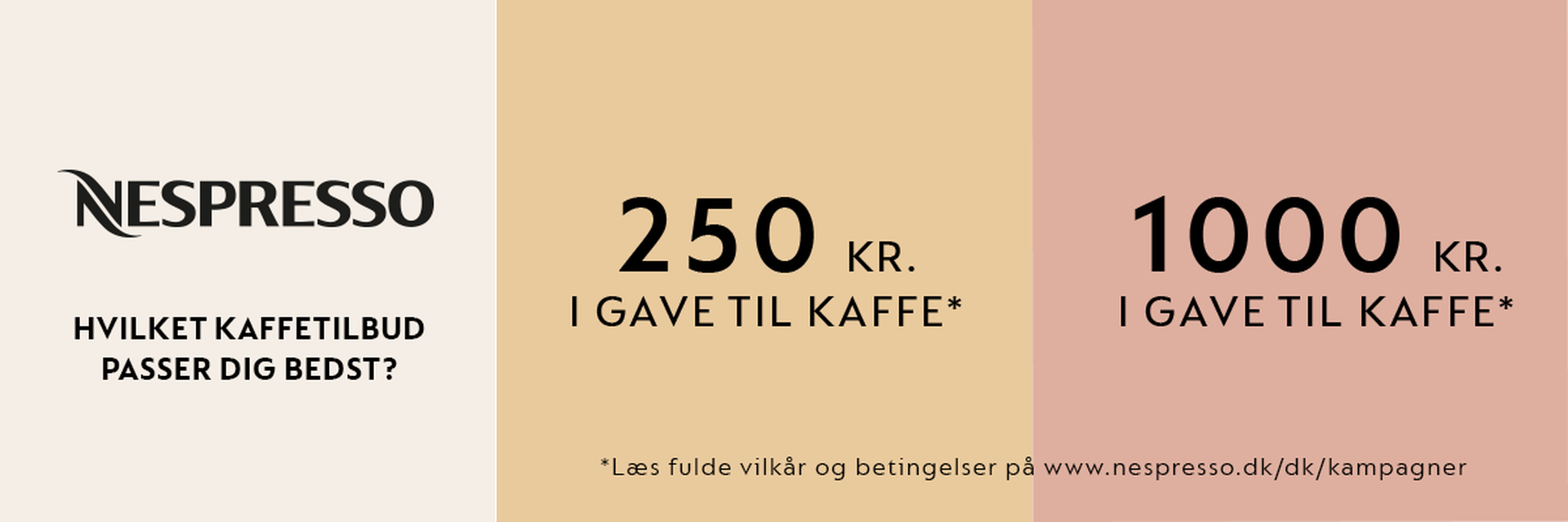 Få Nespresso-kaffekapsler til en værdi af 250 kr. når du lægger din første Nespresso-kaffebestilling samtidig med at du registrerer din kaffemaskine hos Nespresso. Din kaffebestilling skal overstige minimumsbeløbet på 350 kr., for at du kan indløse tilbuddet. Alternativt kan du få Nespresso-kaffekapsler til en samlet værdi af 1000 kr., når du lægger dine første fire Nespresso-kaffebestillinger og registrerer din kaffemaskine med den første af dine fire bestillinger hos Nespresso. Hver kaffebestilling skal overstige minimumsbeløbet på 650 kr., for at du kan indløse tilbuddet. Tilbuddet gælder for Nespresso-kaffemaskiner købt hos en Nespresso-forhandler i Danmark, og kan ikke kombineres med andre tilbud, medmindre andet er angivet.