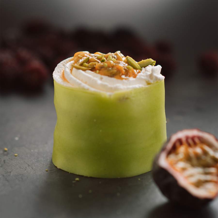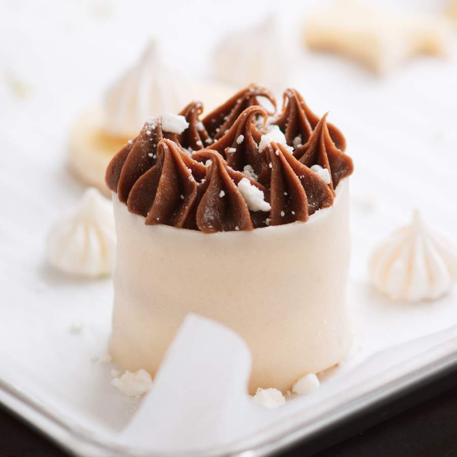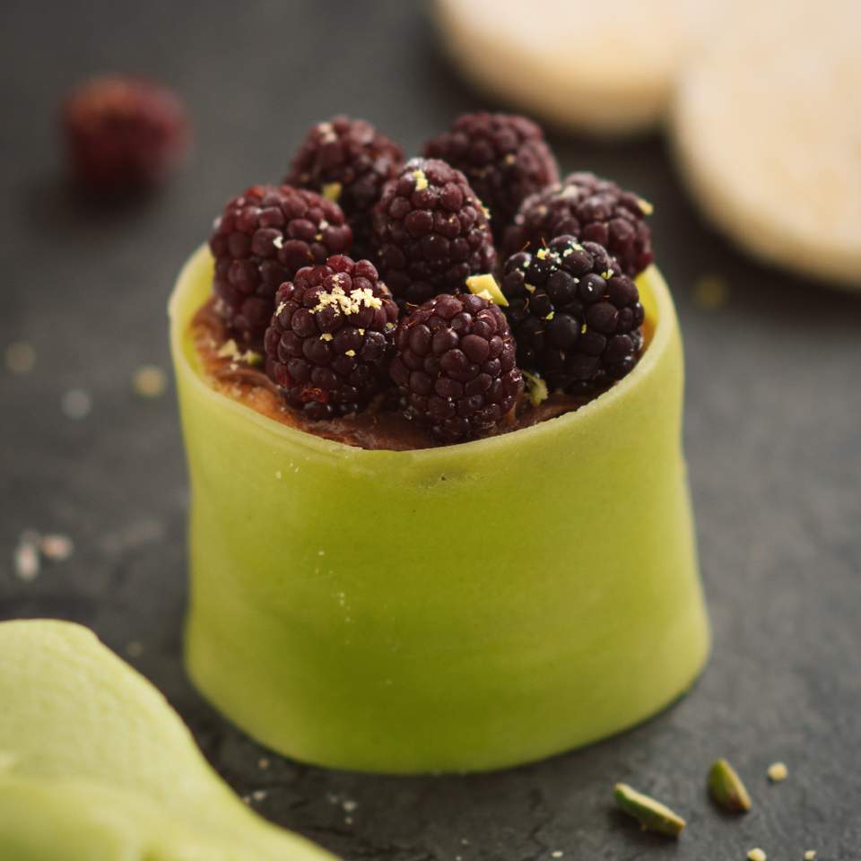 De her minitårterne har toppet med chokoladecreme og marcipan, brombær og pistacienødder og den tredje med fløde og passionsfrugt. Et tyllsæter godt at have, når noget skal dekoreres med fløde. Vælg gerne et med tylkobling så du nemt kan skifte tyl uden at skifte sprøjtepose.