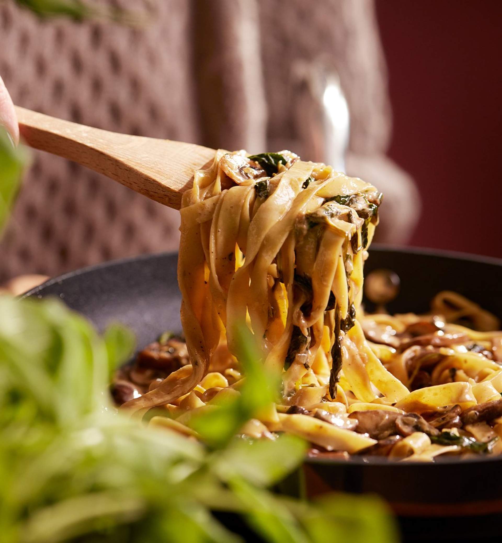 Tilsæt hakket skalotteløg, hvidløg, krydderier og salt, og steg indtil løgene er blanke. Rør spinat i, derefter hvidvin, og lad den koge lidt ind. Tilsæt fløde, og lad det hele simre i et par minutter. Kog pastaen i ca. 1 minut, hæld lidt af pastavandet i pastasaucen, og rør rundt. Hæld vandet fra pastaen, kom det ved pastasaucen, og rør forsigtigt rundt i gryden, indtil pastaen er helt dækket af saucen. Server med brunet smør, hakkede mandler og parmesan.