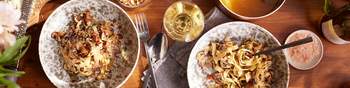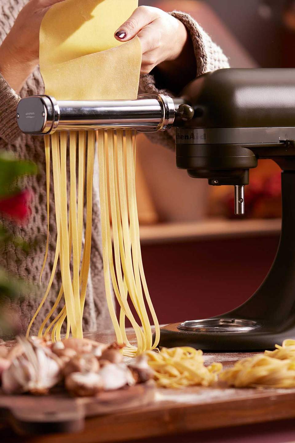 Monter lasagnevalsen på din KitchenAid. Del dejen i 2 stykker, og tryk dem flade. Kør hver del gennem lasagnevalsen på det tykkeste niveau på rullen. Gentag og reducer niveauet trin for trin, indtil du har den ønskede tykkelse. Du kan halvere pastalængden, hvis den bliver for lang og svær at holde. Skift til fettuccine-pastavalsen, og kør pastalængderne igennem. Mel pastaen let, og rul forsigtigt hver stribe op. Lad pastaen tørre, mens du laver pastasaucen.